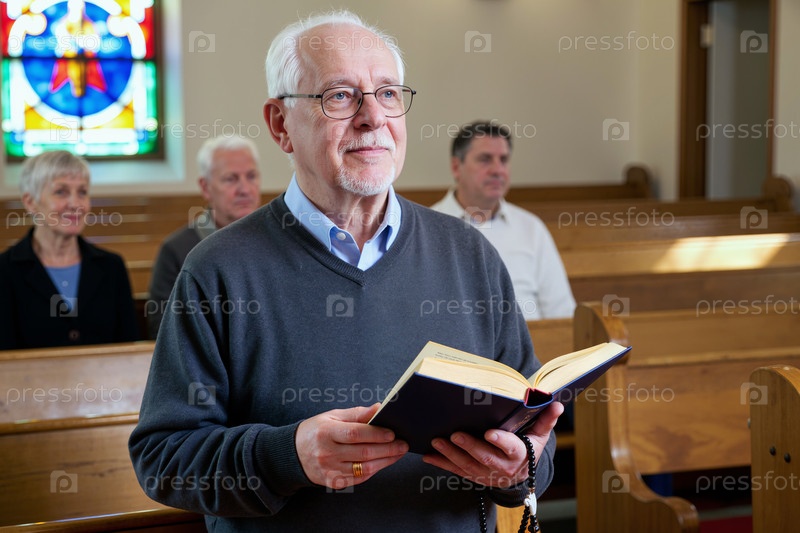 Старший кавказский мужчина читает книгу во время церковной службы с собранием