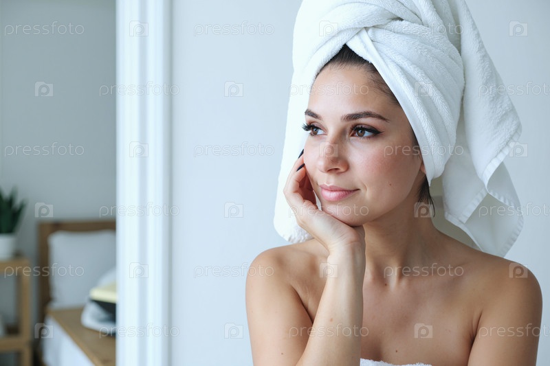 Молодая взрослая белая женщина отдыхает после ванны с полотенцем, завернутым в голову