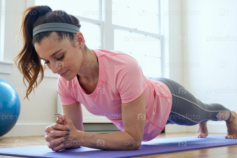 Молодая взрослая кавказская женщина занимается в положении планки на йога-матке в помещении