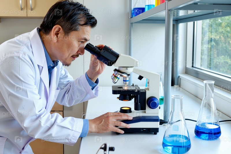 Мужчина среднего возраста из Азии изучает образец с помощью микроскопа в лабораторной обстановке