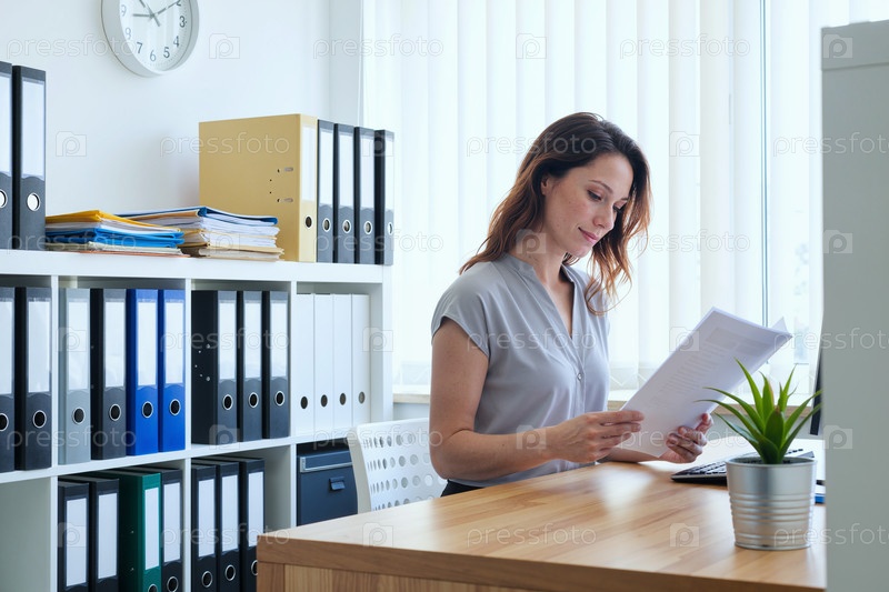Кавказская молодая взрослая женщина просматривает документы в современном офисном рабочем пространстве