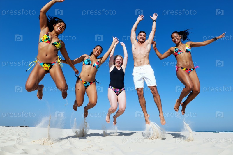 Группа разных молодых взрослых, прыгающих и смеющихся вместе на песчаном пляже