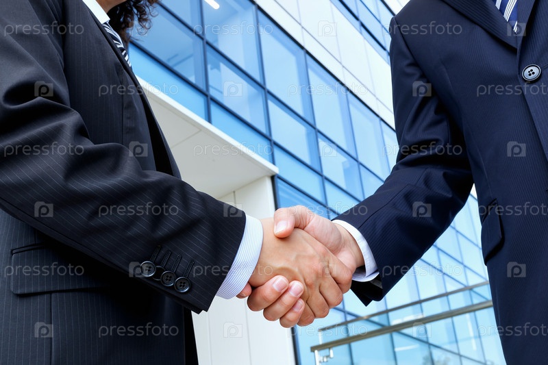 Кавказский молодой взрослый мужчина и азиатский молодой взрослый мужчина пожали друг другу руки на открытом воздухе