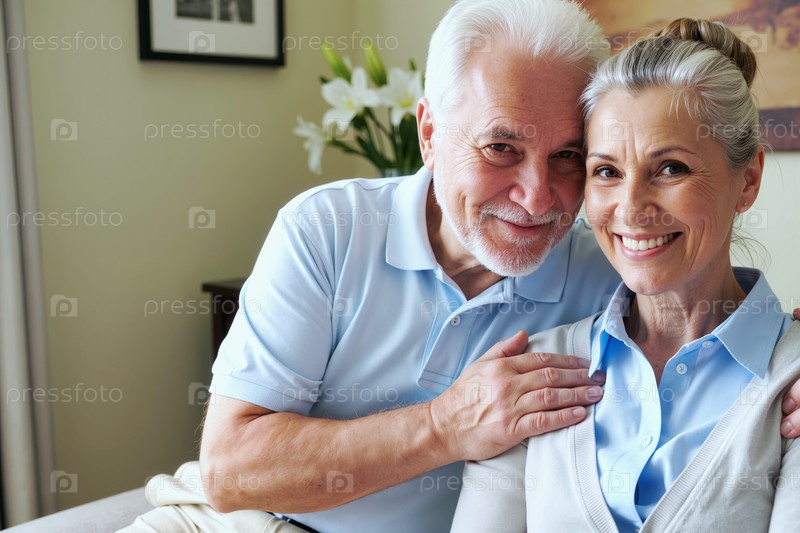 Портрет старшей белокожей пары, улыбающейся и обнимающейся в помещении