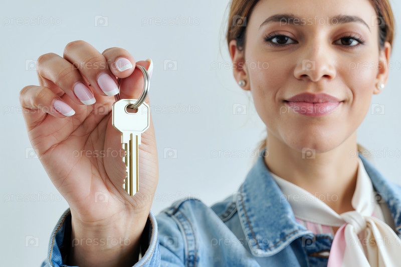 Портрет молодой взрослой женщины, держащей ключ и улыбающейся уверенно