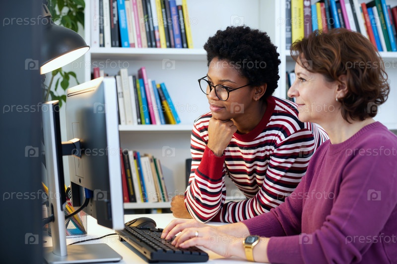 Молодая чернокожая женщина и среднего возраста белая женщина сотрудничают на компьютере