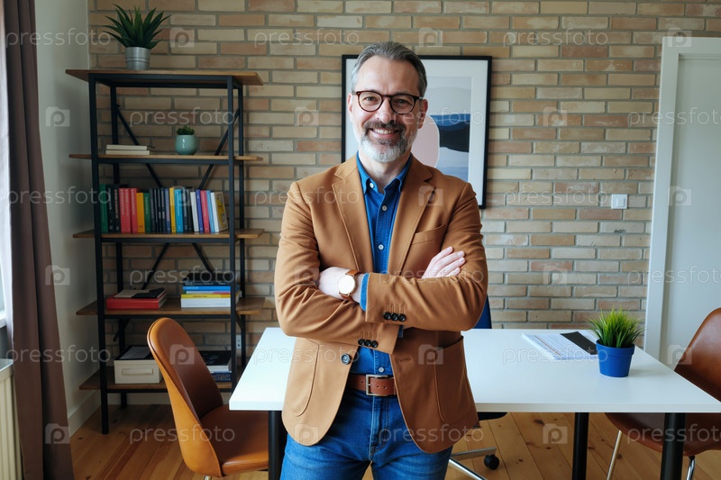 Портрет белого мужчины средних лет, улыбающегося уверенно в современном офисе