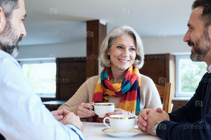 Кавказская женщина средних лет улыбается, разговаривая с двумя мужчинами в помещении
