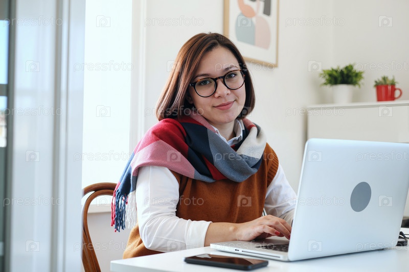 Портрет молодой взрослой белокожей женщины, улыбающейся во время работы на ноутбуке