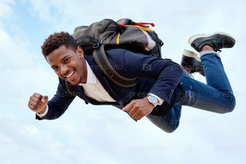Молодой взрослый чернокожий мужчина улыбается, плавая на открытом воздухе с рюкзаком