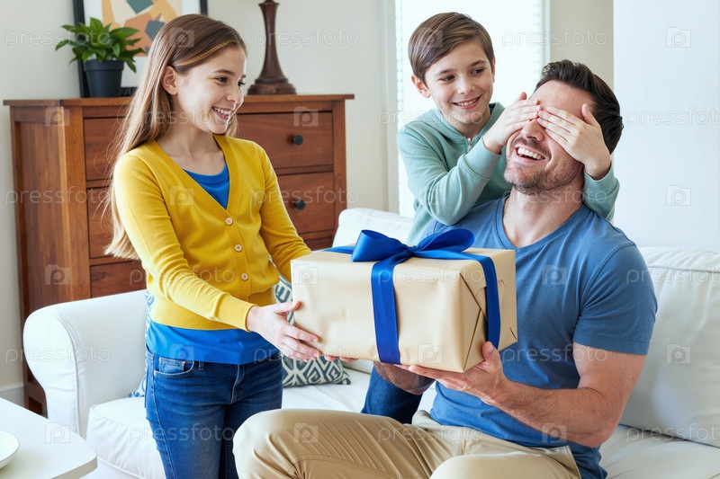 Кавказский мужчина получает подарок от улыбающихся детей дома