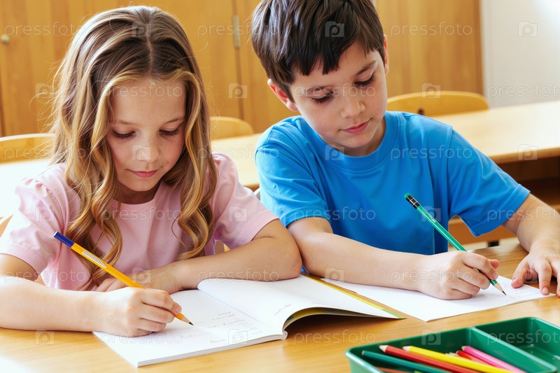 Кавказская девочка и мальчик пишут в тетради, сидя за столом в классе