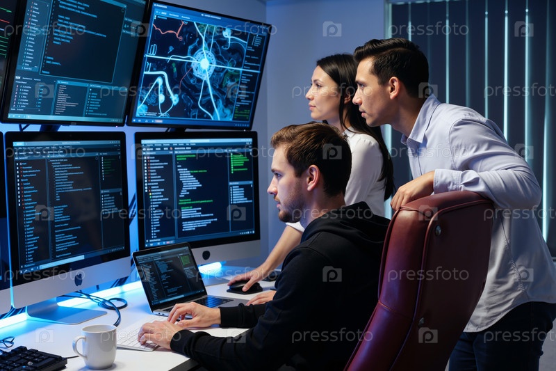 Команда молодых взрослых, отслеживающих угрозы кибербезопасности в контрольной комнате