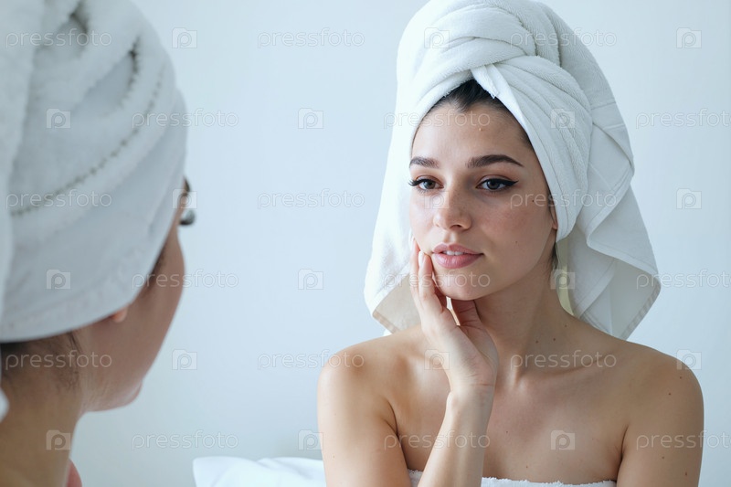 Молодая взрослая белая женщина прикасается к лицу, глядя на отражение в зеркале