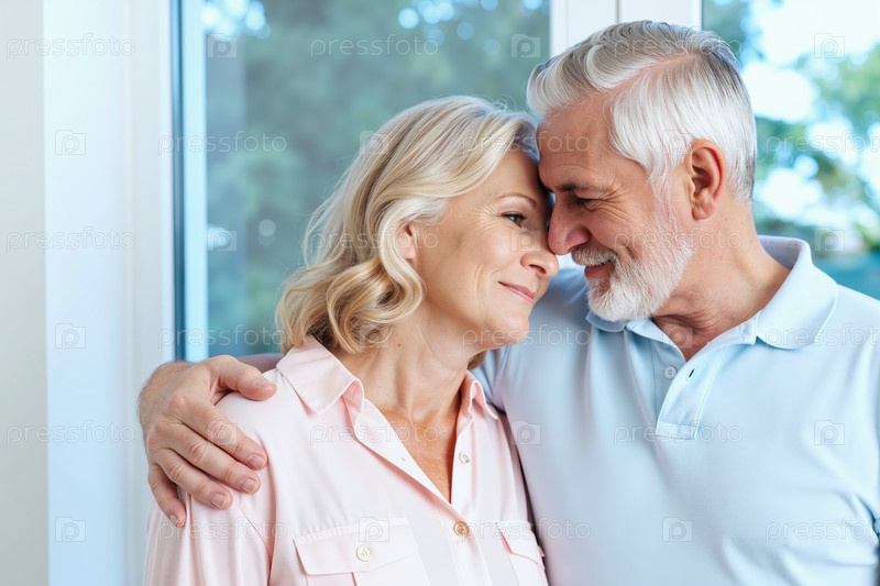 Старшая кавказская пара, которая ласково обнимается и улыбается в помещении
