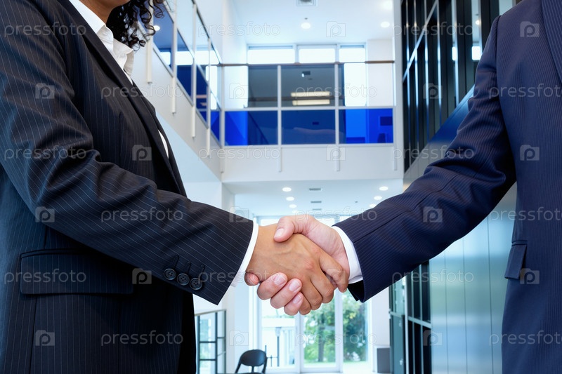 Кавказский мужчина и испаноязычная женщина пожали друг другу руки в современной офисной среде