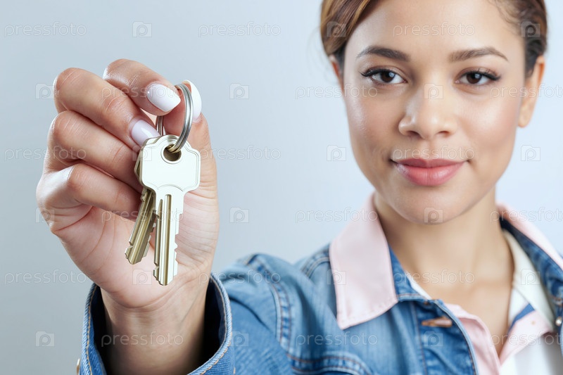 Портрет молодой взрослой бирациальной женщины, держащей ключи от камеры и улыбающейся