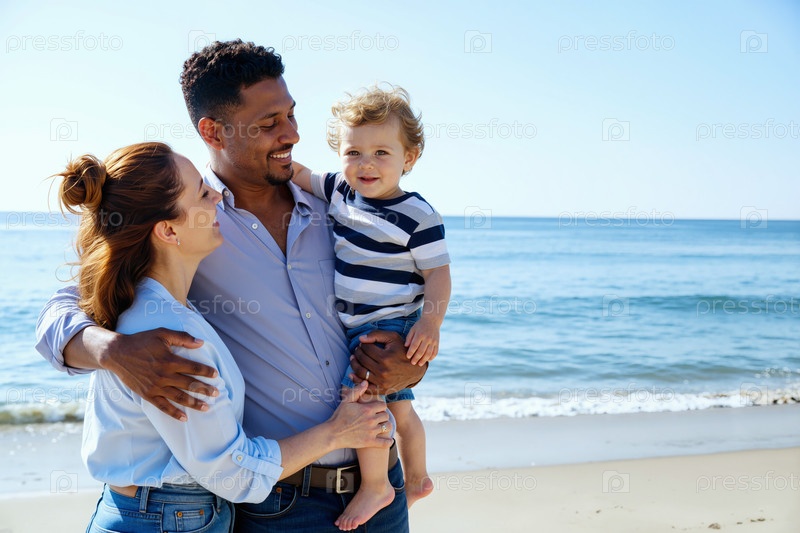 Разнообразные молодые родители держат маленького сына и улыбаются вместе на пляже