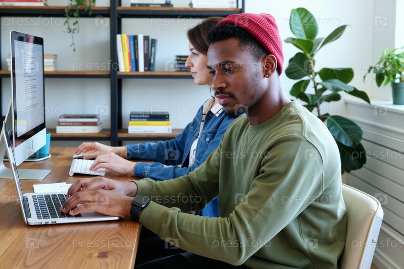 Молодая кавказская женщина и молодой чернокожий мужчина работают на компьютерах в офисе