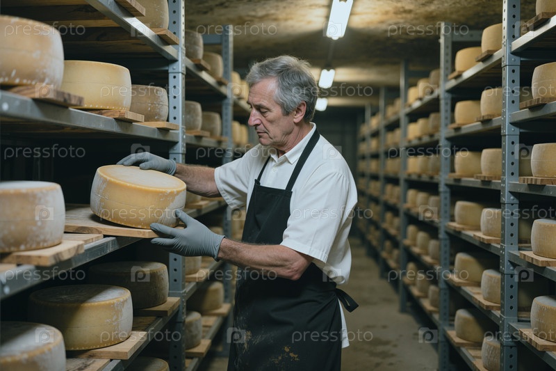 Мужчина, инспектирующий состаренный сыр в молочном подвале