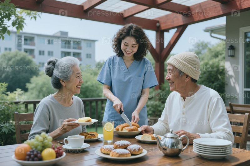 Азиатский опекун, обслуживающий пожилую пару во время завтрака на открытом воздухе