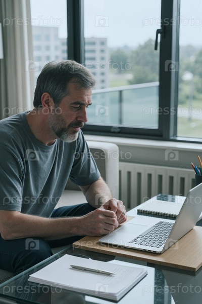 Мужчина средних лет, работающий на ноутбуке в домашнем офисе