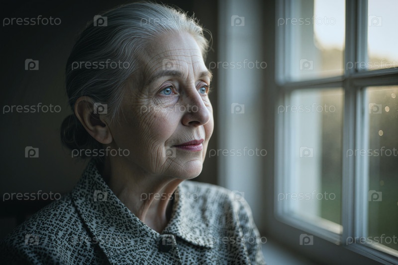 Пожилая женщина смотрит в окно, размышляя о выходе на пенсию