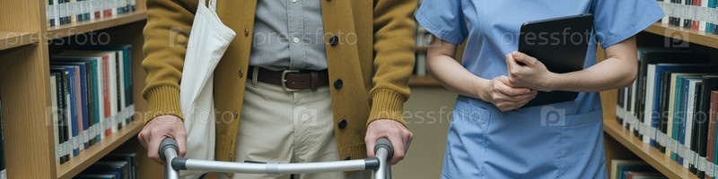 Мужчина-старший использует ходунка с медсестрой, держащей планшет в учреждении ухода