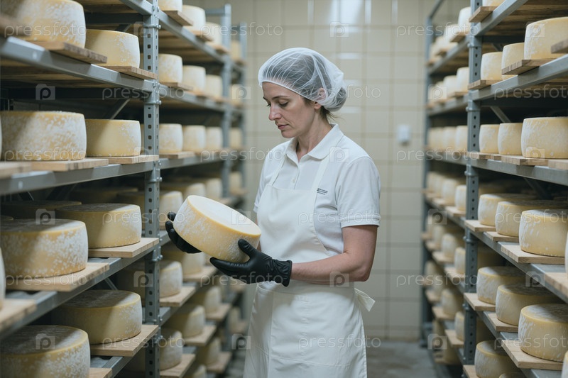 Взрослая женщина инспектирует сырные колёса на молочном заводе