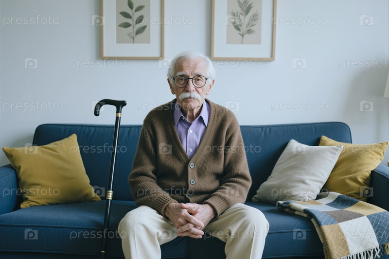 Портрет пожилого человека, сидящего с тростью для концепции домашнего ухода
