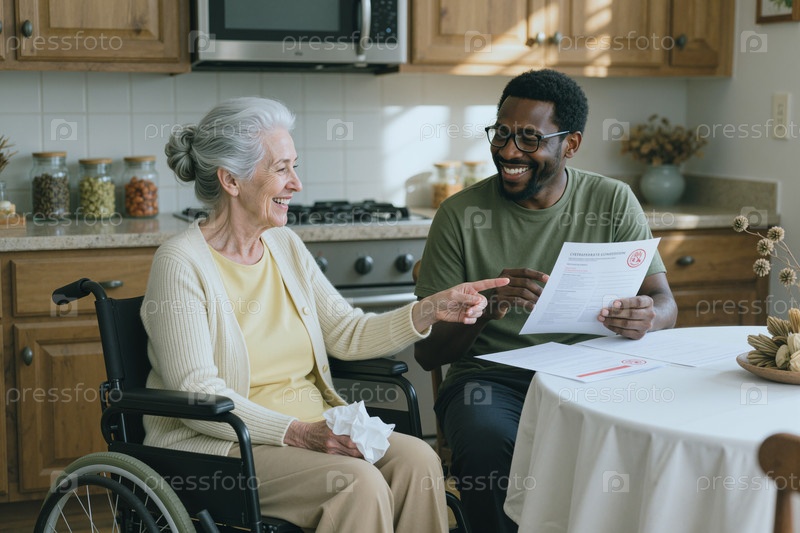 Старшая женщина с инвалидностью просматривает документы вместе с чернокожим мужчиной