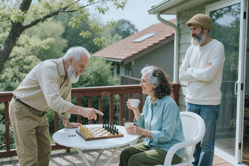 Супружеская пара играет в шахматы на террасе с друзьями, посещающими старших
