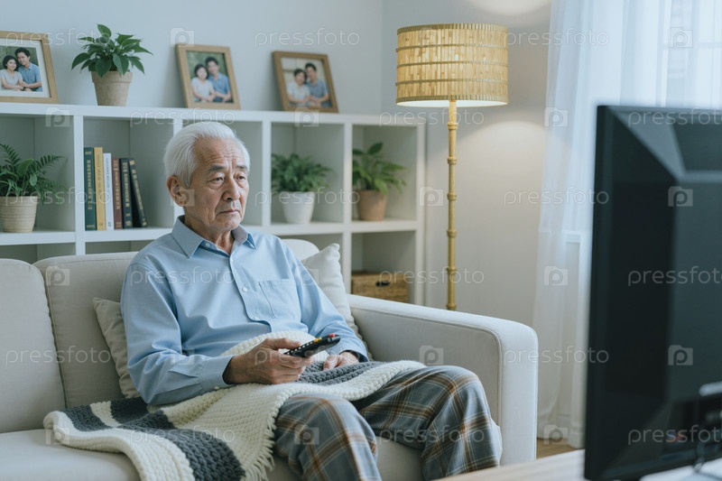 Старший азиатский мужчина смотрит телевизор дома для пенсионного образа жизни