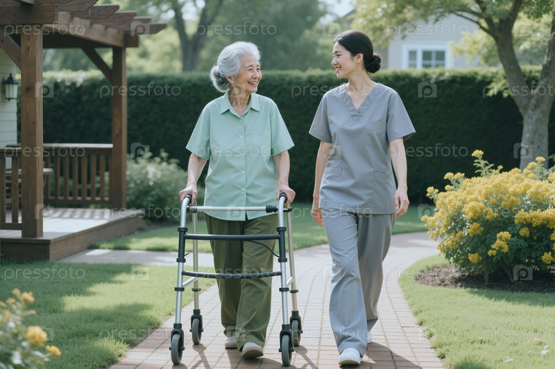 Пожилая азиатская женщина, идущая с опекуном в вспомогательной семье
