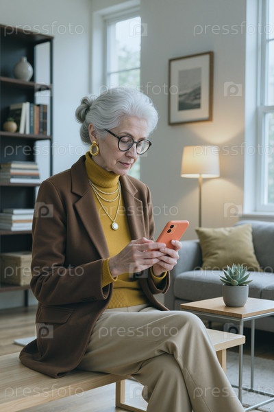 Пожилая женщина использует смартфон для онлайн-коммуникации дома