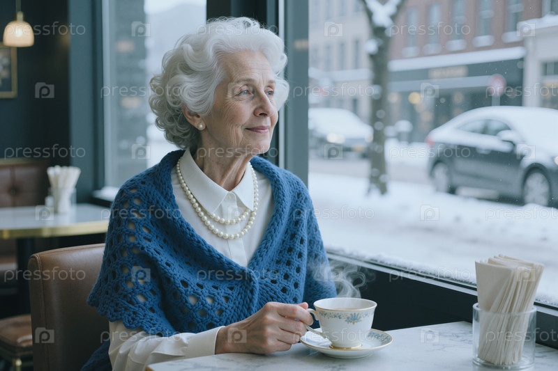 Старшая женщина пьет кофе у окна в уютном зимнем кафе