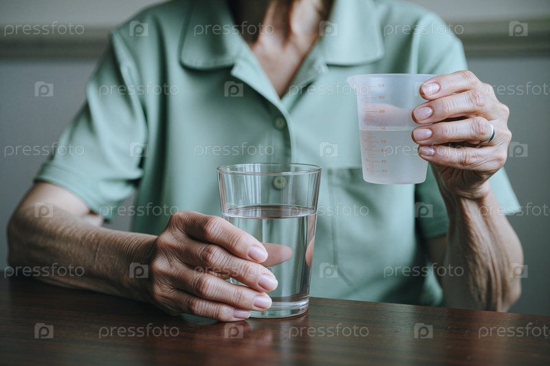 Старшая женщина измеряет жидкую медицину с помощью воды для домашнего ухода