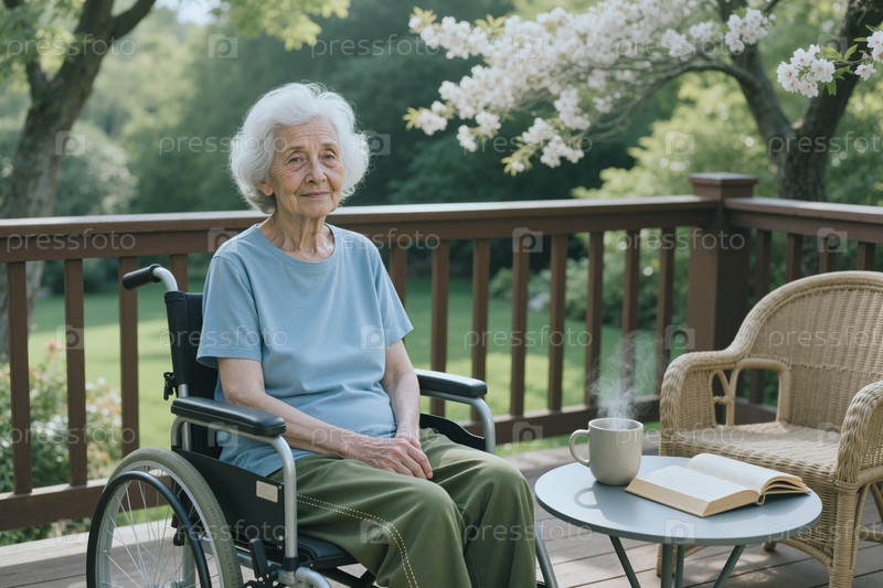 Портрет пожилой женщины с инвалидностью, отдыхающей на садовом палубе