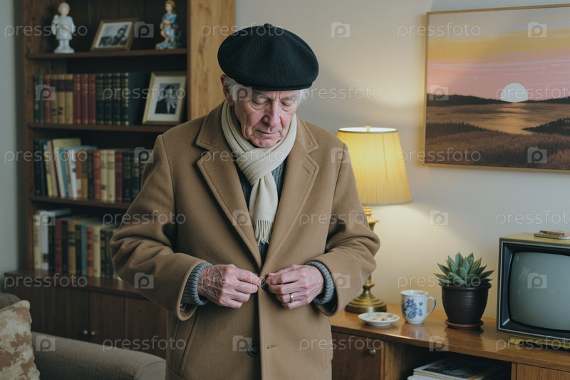 Старший мужчина застегивает пальто дома перед отъездом на зиму Errand