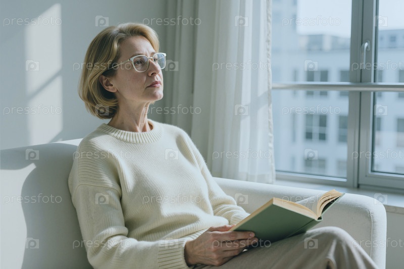Женщина средних лет читает книгу и размышляет дома