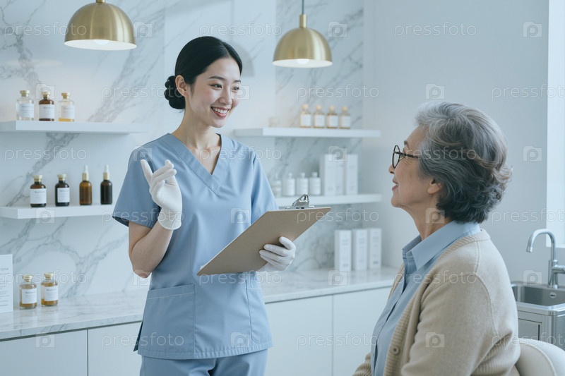 Взрослый медсестра консультирование старшая азиатская женщина в эстетической клинике