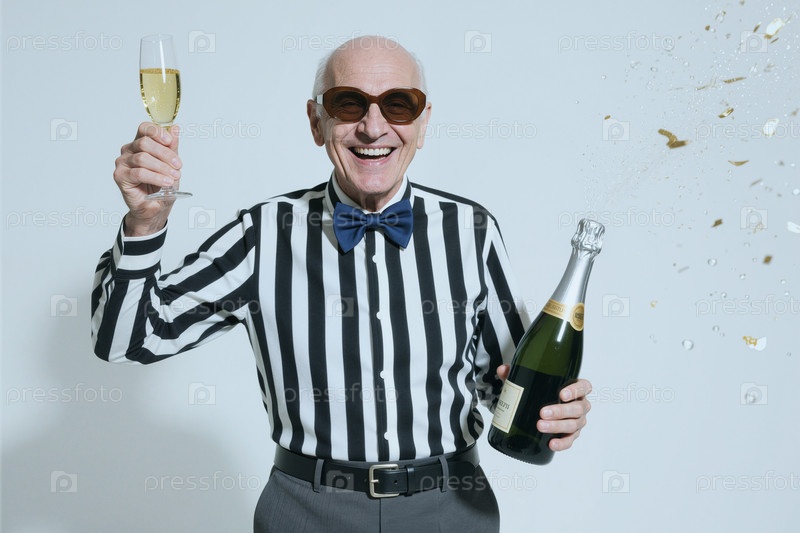 Портрет пожилого человека, выпивающего шампанским для празднования