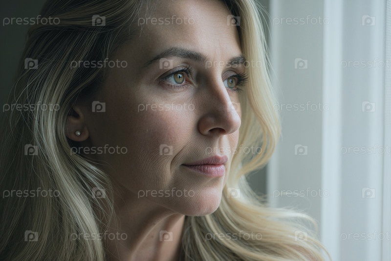 Женщина среднего возраста смотрит в окно во время отражения