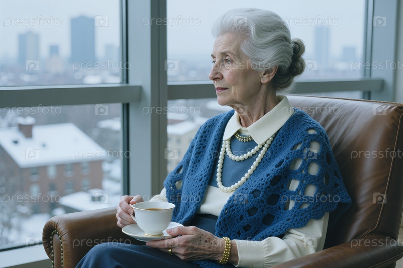 Пожилая женщина пьет чай у окна в пенсионном доме