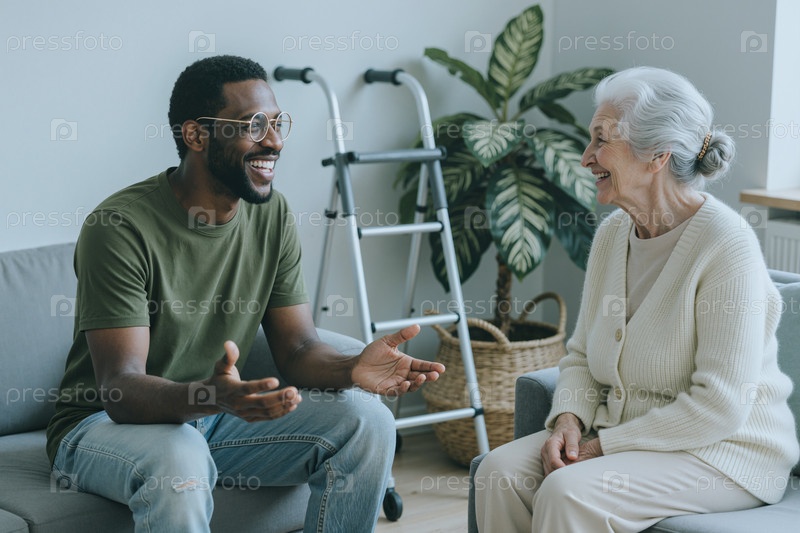 Опекун-чернокожий мужчина разговаривает со старшей женщиной во время домашнего посещения