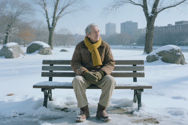 Мужчина, сидящий на парковой скамейке зимой за одиночество Senior Concept