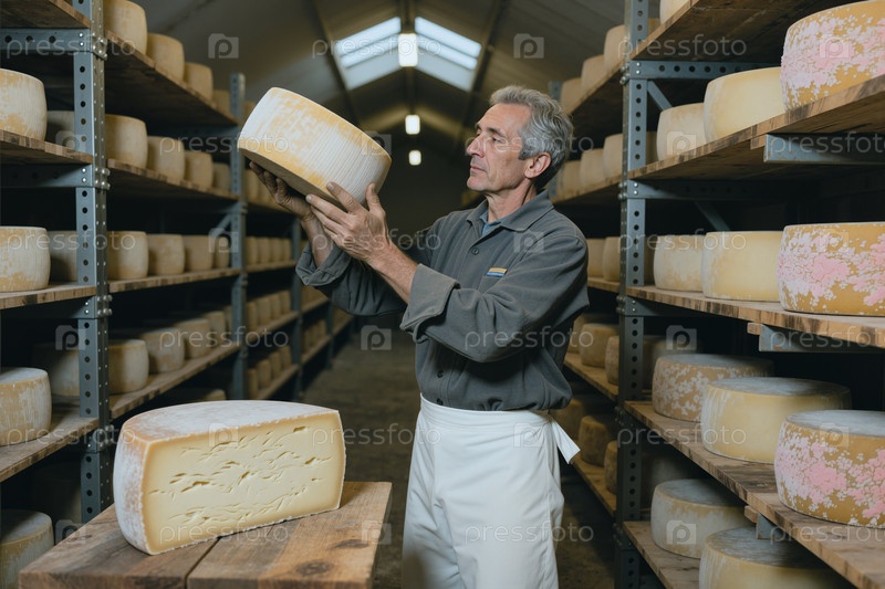 Старший сыроделец, инспектирующий старые сырные колеса в производственном подвале