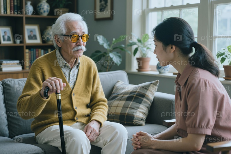Старший азиатский мужчина консультирует опекуна во время гостевого визита