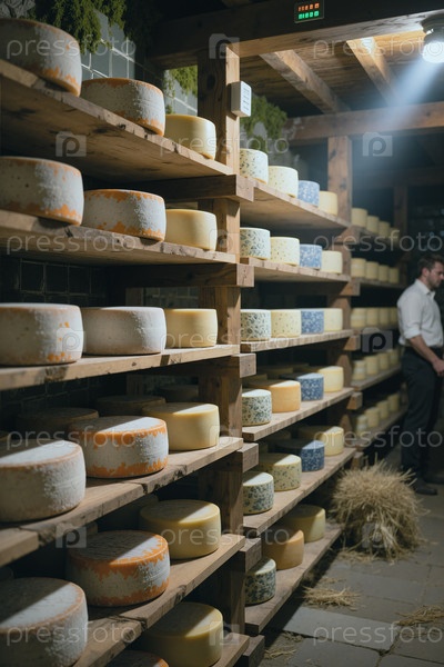 Сырные колёса стареют на деревянных полках в мастерском молочном подвале