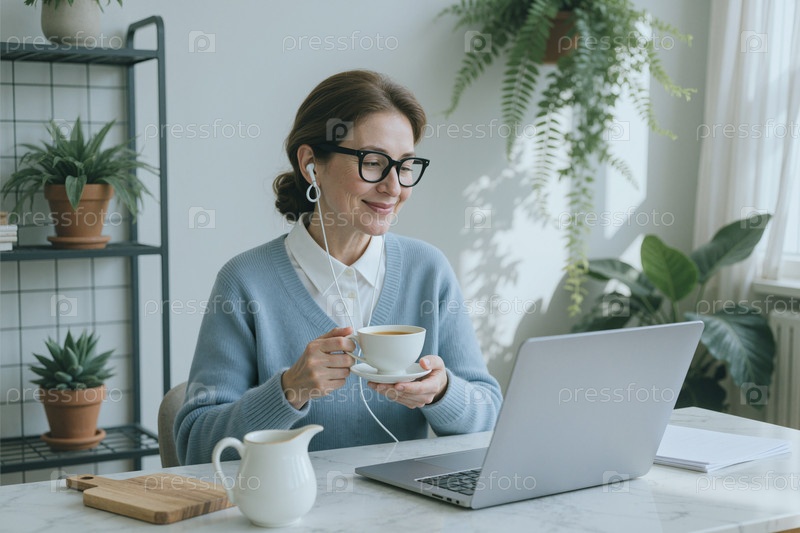 Женщина среднего возраста пьет кофе во время удаленного видеозвонка